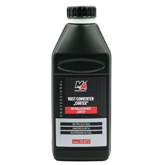 MA Professional Neutralizator rdzy Cortex to wysokiej jakości neutralizator rdzy hamujący rozwój korozji. Po nałożeniu na skorodowaną powierzchnię zmienia aktywna rdzę w stabilny neutralny materiał zabiegając trwałemu uszkodzeniu elementu. Jeżeli przedmiot narażony jest na zewnętrzne warunki atmosferyczne pokrytą neutralizatorem rdzy powierzchnię należy dodatkowo zabezpieczyć lakierem / farbą.