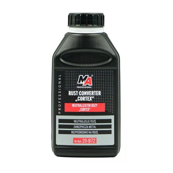 MA Professional Neutralizator rdzy Cortex to wysokiej jakości neutralizator rdzy hamujący rozwój korozji. Po nałożeniu na skorodowaną powierzchnię zmienia aktywna rdzę w stabilny neutralny materiał zabiegając trwałemu uszkodzeniu elementu. Jeżeli przedmiot narażony jest na zewnętrzne warunki atmosferyczne pokrytą neutralizatorem rdzy powierzchnię należy dodatkowo zabezpieczyć lakierem / farbą.